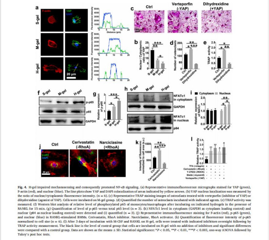 意義:揭示剛度通過(guò)整合素負(fù)調(diào)控RhoA-ROCK2通路,削弱力學(xué)傳導(dǎo),促進(jìn)NF-κB驅(qū)動(dòng)的破骨細(xì)胞分化(圖4f-i)。