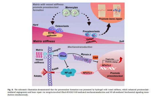 力學(xué)傳導(dǎo)核心機(jī)制:基質(zhì)剛度通過(guò)整合素β3-RhoA-ROCK2-YAP通路負(fù)調(diào)控力學(xué)信號(hào),激活NF-κB促進(jìn)破骨細(xì)胞分化(圖8)。