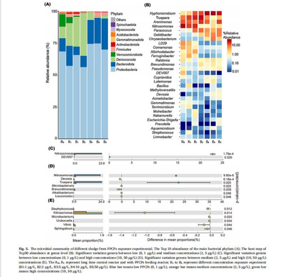 3. 微生物響應:低濃度PPCPs(≤1 μg/L)降低微生物豐富度與多樣性,但群落結構穩定;高濃度(≥5 μg/L)增加多樣性,顯著改變群落組成(如亞硝化單胞菌屬Nitrosomonas豐度從22%降至8.5%)。