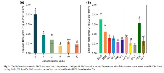 2. N?O減排效應:PPCPs暴露顯著降低N?O排放(50–66%),不同PPCPs的減排效果存在差異(如羅紅霉素減排較弱)。