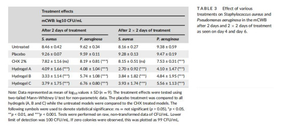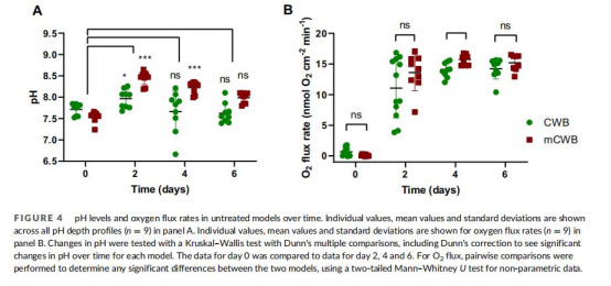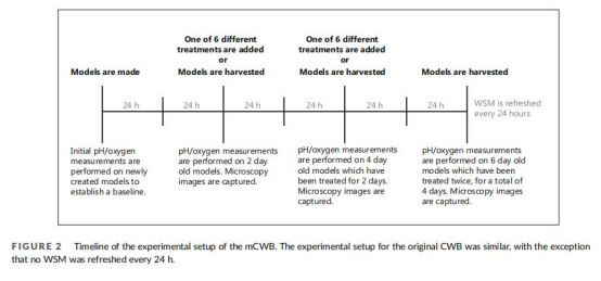 研究采用分層改進策略。首先,優化原始慢性傷口生物膜模型(CWB):將瓊脂基質替換為膠原(2 mg/mL),添加生理鹽水緩沖液(PBS),并在Transwell插入裝置中構建兩層結構——真皮層(含血清、血液、膠原)和脂肪層(含豬脂肪、膠原)。雙菌種接種:銅綠假單胞菌加入下層,金黃色葡萄球菌加入上層,初始菌量為100-200 CFU。模型置于傷口模擬培養基中,每24小時更換培養基以模擬營養動態輸入。其次,測試抗菌產品:水凝膠(pH 2.2–2.5)和洗必泰(pH 5.9)單次或重復(2×2天)應用于模型表面。評估包括菌落計數、pH/氧氣微梯度測量(使用丹麥Unisense微電極)和共聚焦顯微鏡成像。整個流程在6天內完成,覆蓋基線、治療中和治療后階段。