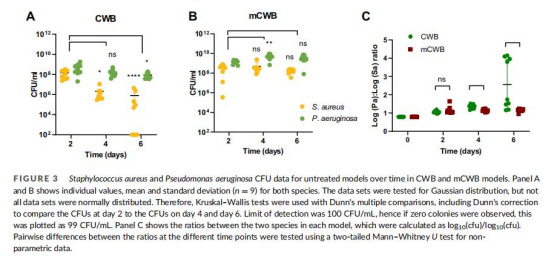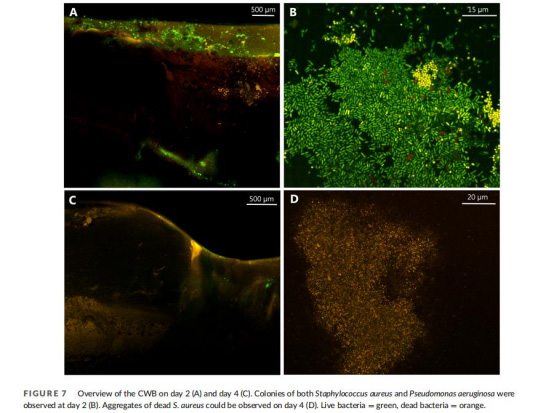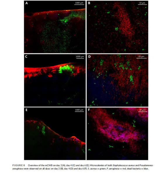 圖7顯示原始CWB模型中S.aureus形成微菌落但被P.aeruginosa抑制,死亡菌體聚集。圖8中mCWB模型(如day 4)顯示雙菌種形成大型生物膜聚集體和微菌落,S.aureus分布更深(至脂肪層)。意義在于:證實模型支持復雜生物膜發育(如菌種空間分層),模擬臨床傷口中菌群的異質性和耐受機制,為抗生物膜策略提供形態學依據。