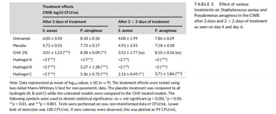 這篇論文開發了一種改進的體外慢性傷口生物膜模型(mCWB),旨在更真實地模擬人類慢性傷口的微環境。核心創新包括:用哺乳動物膠原替代植物源瓊脂作為基質;通過Transwell插入裝置實現傷口模擬培養基的動態營養交換;接種金黃色葡萄球菌(Staphylococcus aureus)和銅綠假單胞菌(Pseudomonas aeruginosa)形成雙菌種生物膜。模型在33°C下培養,模擬傷口溫度。測試了三種含活性有機酸的可降解淀粉水凝膠(Hydrogel A/B/C)及2%洗必泰(CHX)對照。結果顯示,水凝膠顯著降低菌落數(CFU),逆轉堿性pH至酸性環境,并緩解氧氣消耗,效果優于洗必泰。模型成功模擬了慢性傷口的缺氧、高pH和多菌種共存特征。