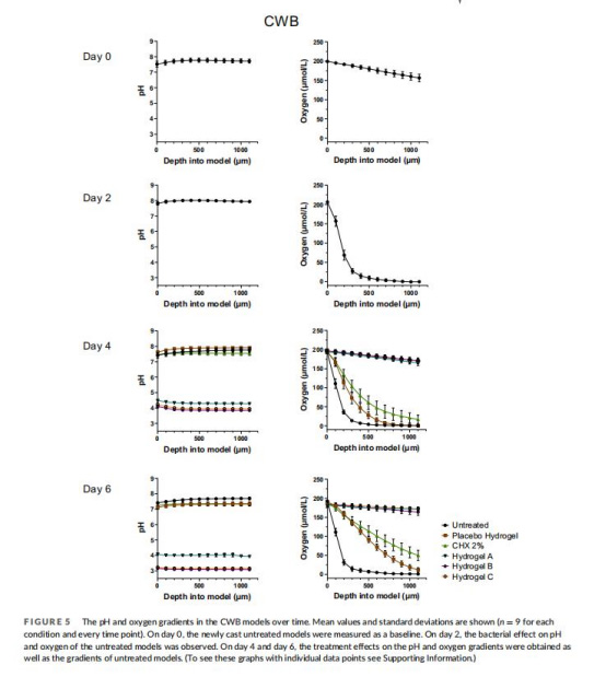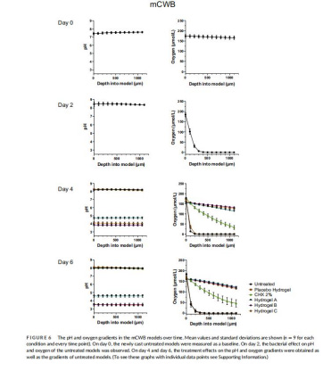 圖4顯示未處理模型pH升至>8.0(mCWB更持久),氧氣通量率升高至~13.6 nmol O?cm?2min?1(表示細菌呼吸導致缺氧)。圖5-6中,水凝膠將pH降至3.1–4.6(例如Hydrogel B pH=3.1),氧氣梯度恢復至基線(滲透深度>1 mm),洗必泰僅輕微改善pH(~7.3)和氧氣梯度。意義在于:高pH和缺氧是慢性傷口非愈合的關鍵標志,水凝膠通過酸化逆轉微環境,支持組織修復(低pH促血管生成和免疫反應),而氧氣恢復表明代謝負擔減輕。