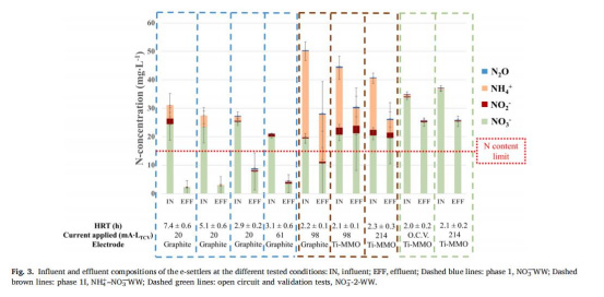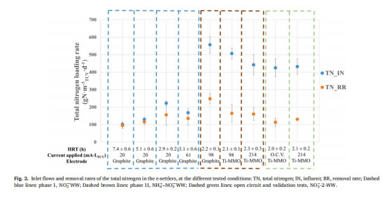 研究意義:量化e-settler在不同條件下的脫氮效能(最高248 ± 29 g N·m?3·d?1),證明電流刺激能顯著提升反硝化過程,減少氮污染排放,符合環境排放標準(如歐盟Directive 91/271/EEC的15 mg N·L?1限值)。