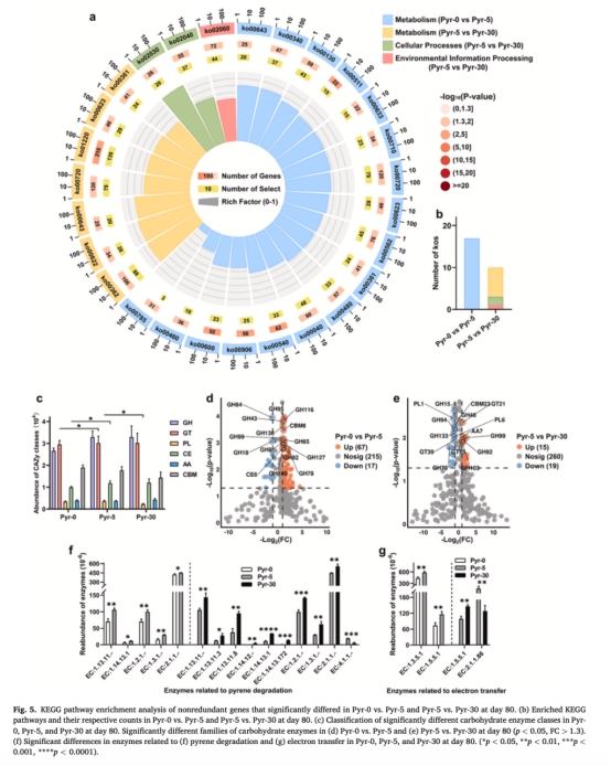 數據:低芘濃度(Pyr-5)激活碳水化合物代謝酶(如糖基轉移酶GTs);高芘濃度(Pyr-30)抑制外膜電子傳遞酶(EC:2.1.1.86),同時芘降解酶多樣性增加(圖5f)。
