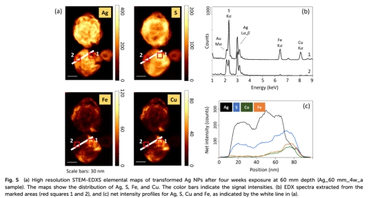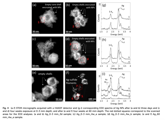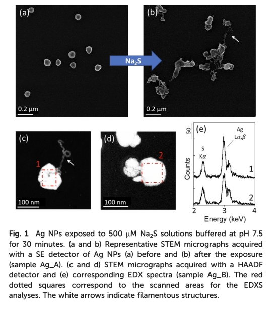 方法驗(yàn)證:在Na?S溶液中暴露TEM網(wǎng)格固定的Ag/ZnO NPs(圖1,2),通過STEM-EDXS觀察硫化進(jìn)程