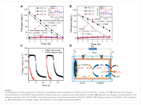 脫氮路徑創新:DNMFC以異養反硝化為主(92.3% NO??去除),電化學還原為輔(7.7%);氧氣是主要電子受體(消耗83.3%電子),硝酸鹽僅消耗16.7%。