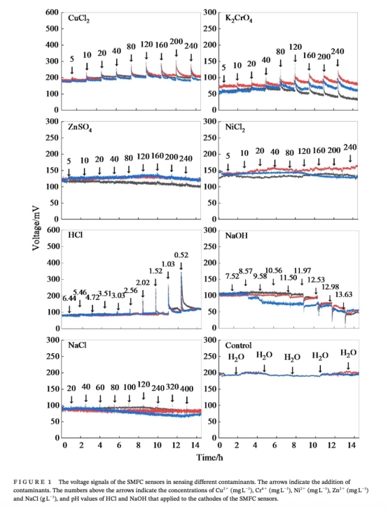 闡明SMFC傳感器對不同類型污染物(重金屬、鹽、酸、堿)的傳感性能差異。