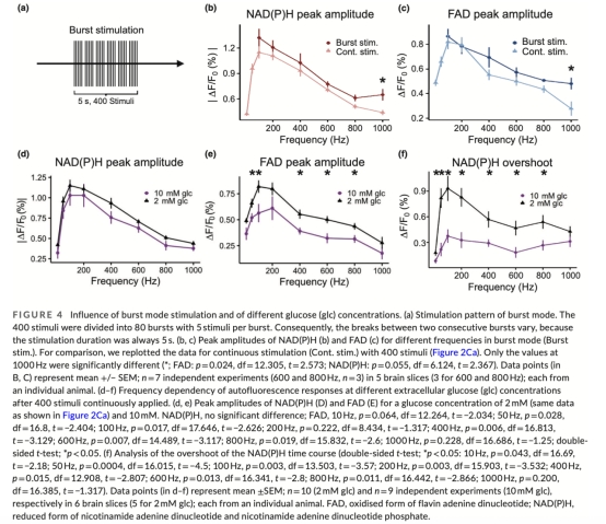 爆發式刺激模式(固定時長)與連續刺激的代謝響應無顯著差異,支持平均放電頻率(而非時間模式)主導能量需求(圖4b-c)。