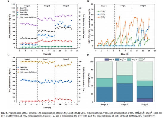 SO?去除:受NOx抑制后快速恢復(第18天:98.56%),證明系統適應性(圖3C)。