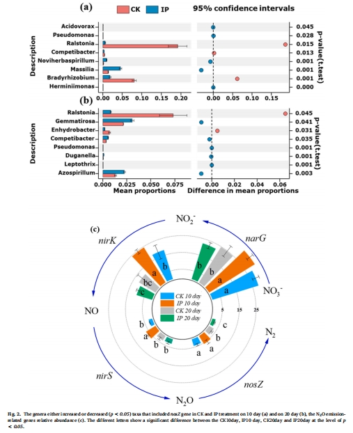 IP組nosZ基因豐度降低(第20天),N?O還原菌(Ralstonia, Bradyrhizobium)減少。