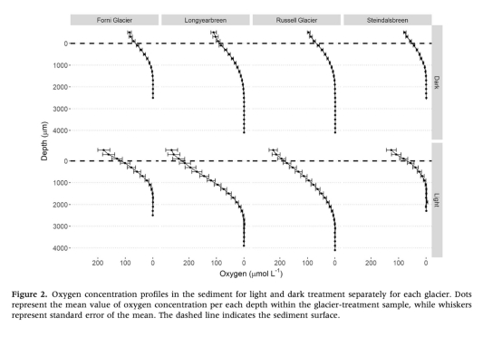 光照下所有樣品均出現(xiàn)厭氧區(qū),深度因冰川來源而異(北極冰川3100μm vs. 阿爾卑斯冰川1500μm);