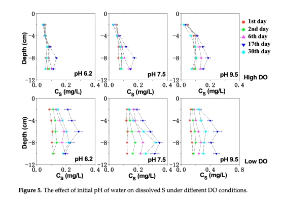 意義:低DO下溶解Fe/Mn峰值達5.65 mg/L和13.79 mg/L(pH 9.5),證明鐵錳還原溶解是砷釋放的主要途徑;溶解S濃度升高(0.41 mg/L)指示硫酸鹽還原參與砷遷移。