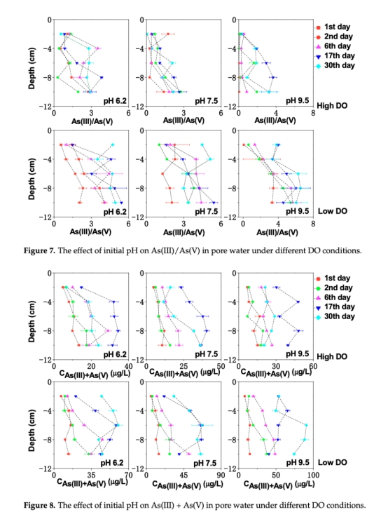 Eh剖面(圖1)顯示低DO組沉積物深層(>3 cm)Eh降至-125 mV,明確界定砷還原區(As(V)→As(III)需Eh<+100 mV),解釋As(III)/As(V)比值升高(圖7)。