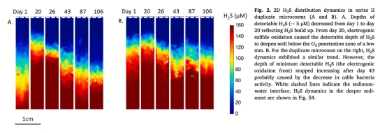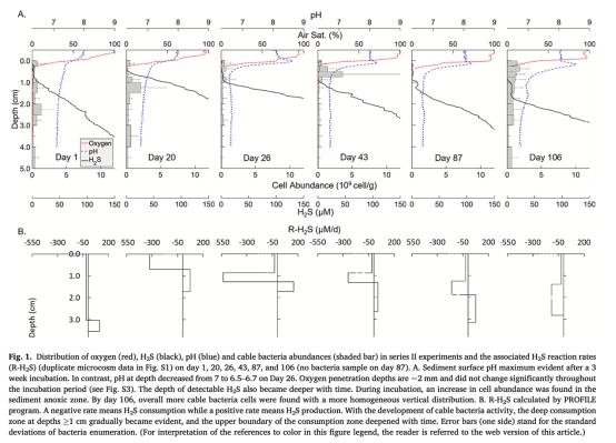測(cè)量數(shù)據(jù):電纜細(xì)菌豐度垂直分布(AO染色/FISH技術(shù))(來(lái)自圖1,3)。研究意義:量化菌絲密度(最高2840 m/cm2)及時(shí)空動(dòng)態(tài)(初期富集亞表層0.25-1.5cm,后期向表底層擴(kuò)散),關(guān)聯(lián)代謝活性變化。