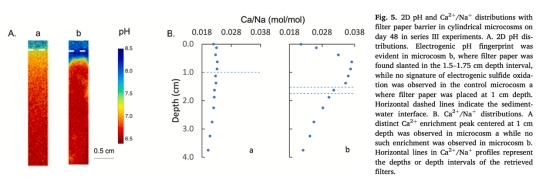電纜細(xì)菌可在Fe/Mn貧乏碳酸鹽沉積物中建立活性,直接利用溶解態(tài)H?S(無(wú)需固態(tài)硫化物或Fe3?介導(dǎo)的硫歧化),形成陰極區(qū)(0-2mm)pH峰值(~8.5)和陽(yáng)極區(qū)(≥1cm)H?S消耗,無(wú)典型亞氧化區(qū)。