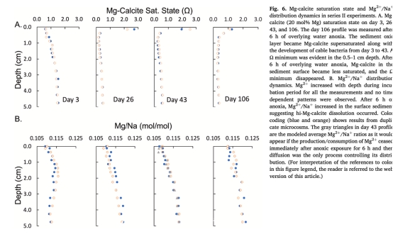 探討了電纜細(xì)菌在缺乏鐵(Fe)和錳(Mn)的碳酸鹽沉積物(美國(guó)佛羅里達(dá)灣)中的活動(dòng)及其對(duì)元素循環(huán)的影響。通過(guò)實(shí)驗(yàn)室微宇宙實(shí)驗(yàn),結(jié)合高分辨率傳感技術(shù)(如平面光學(xué)傳感器和微電極),研究發(fā)現(xiàn)電纜細(xì)菌可利用深層溶解態(tài)硫化物(H?S)作為還原劑,無(wú)需依賴(lài)固態(tài)硫化物或鐵錳循環(huán)即可維持電硫氧化(e-SOx)代謝。電硫氧化導(dǎo)致沉積物表層(陰極區(qū))pH升高(~8.5)促進(jìn)文石和高鎂方解石沉淀(Ω=2-3),而亞表層(陽(yáng)極區(qū))pH降低(~6.5)引發(fā)碳酸鹽溶解(Ω=0.2-0.3),伴隨Ca2?、Mg2?釋放。磷酸鹽(ΣPO?3?)在電活性區(qū)被消耗,可能與電纜細(xì)菌細(xì)胞內(nèi)聚磷酸鹽積累有關(guān),這對(duì)磷受限的碳酸鹽沉積物中海草磷獲取有潛在意義。