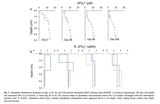 磷循環(huán)受電纜細(xì)菌活動(dòng)調(diào)控:電活性區(qū)(0-2cm)ΣPO?3?凈消耗(R-ΣPO?3?=-0.5~-2.5μM/d,圖7B),可能因細(xì)胞內(nèi)聚磷酸鹽積累(估算消耗孔隙水磷50-900μM)及碳酸鹽吸附;這對(duì)海草磷獲取有潛在意義。