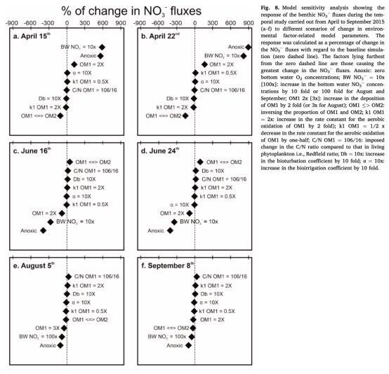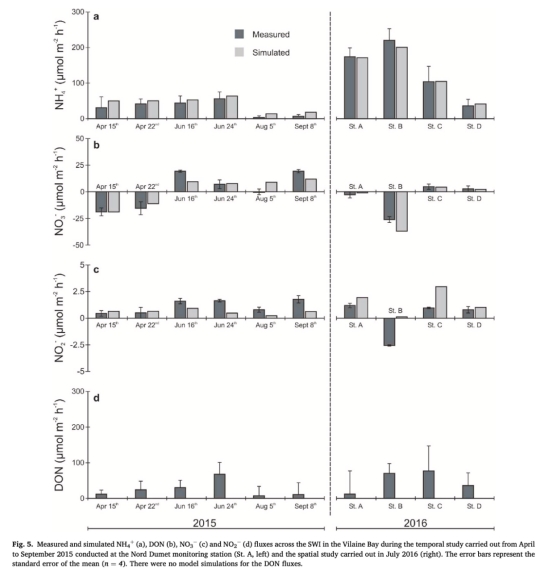 研究通過現場觀測、實驗室測量和反應輸運模型(RTM),探究了法國富營養化溫帶大型潮汐海灣——Vilaine灣(VB)底棲氮(N)循環的時空變化。基于2015年單站時間序列(6次)和2016年多站空間調查的數據分析表明: