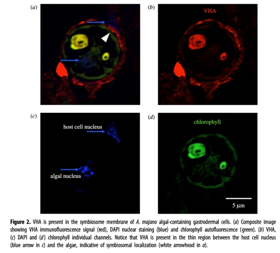 數(shù)據(jù)來源:免疫熒光顯示VHA信號(紅色)環(huán)繞藻類葉綠素(綠色),位于宿主細(xì)胞核與共生體之間(圖2)。