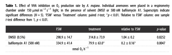 數(shù)據(jù)來源:抑制VHA后,光合產(chǎn)氧量從334.9 ± 41.4 nmol O?·h?1降至79.9 ± 63.0 nmol O?·h?1(表1)。