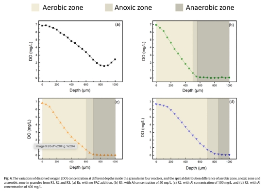 通過DO梯度曲線(圖4)直接量化顆粒內部氧擴散深度(如R1:600μm),明確低劑量PAC(50 mg/L)形成最大厭氧區(DO<0.2 mg/L區域占比最高),為高反硝化速率(20.55 mgN/g-MLSS·h)提供空間證據。