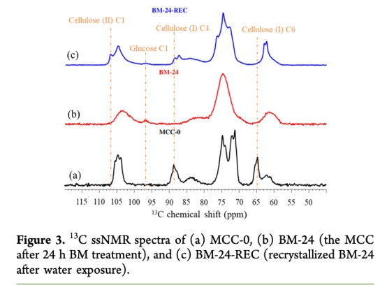 2. 水誘導(dǎo)重結(jié)晶驗證:將球磨后MCC暴露于水(40°C,30 min),通過XRD(圖2a)和固態(tài)NMR(圖3)檢測纖維素II型形成。