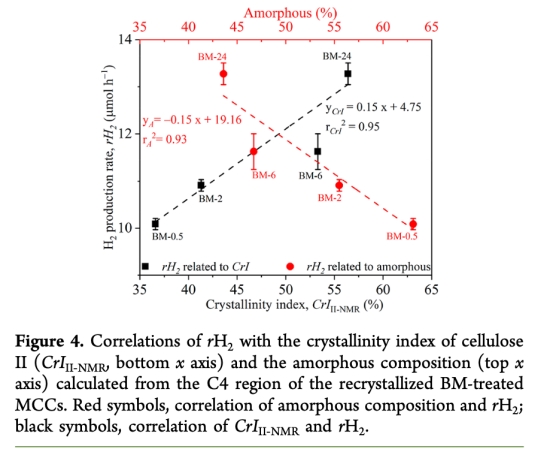 2. 纖維素II型比例(CrIII)與H?產(chǎn)率(rH?)正相關(guān),歸因于其疏松晶格結(jié)構(gòu)提升水解效率。
