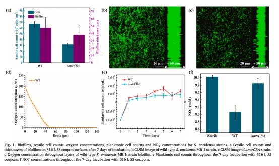 4. 厭氧條件下,野生型菌株利用不銹鋼電子還原硝酸鹽,而ΔmtrCBA喪失此能力(圖1f)。