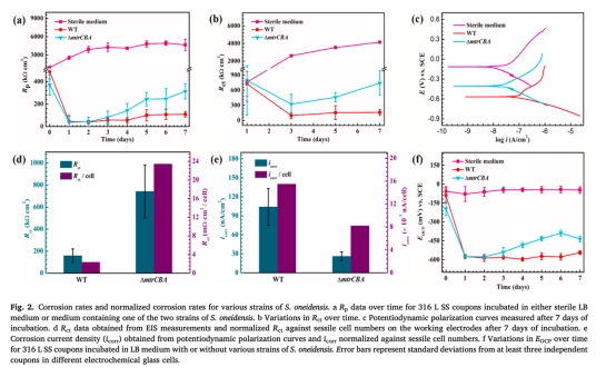 2. MtrCBA復合體是電子攝取關鍵通道,其缺失使腐蝕率降低(ΔmtrCBA的腐蝕電流密度僅野生型50%,見圖2e);