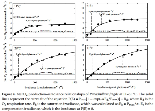 Ek:31°C時達833 μmol光子/m2/s(11°C的3倍)。