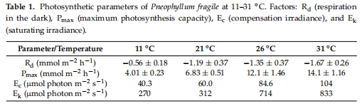 溫度適應性:P. fragile在高溫(31°C)下最大光合能力(Pmax)和暗呼吸速率(Rd)比低溫(11°C)高約3倍。