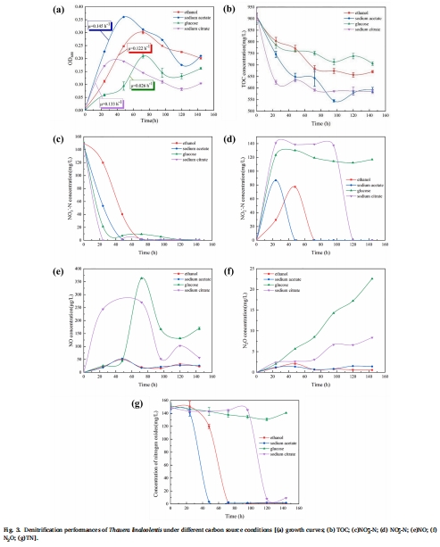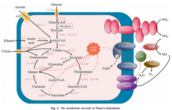 研究以反硝化模式菌株Thauera linaloolentis為對象,通過基因組測序(KEGG注釋)重建代謝網(wǎng)絡(luò)(圖2),探究四種碳源(乙醇/乙酸鈉/葡萄糖/檸檬酸鈉)對反硝化過程的影響機(jī)制: