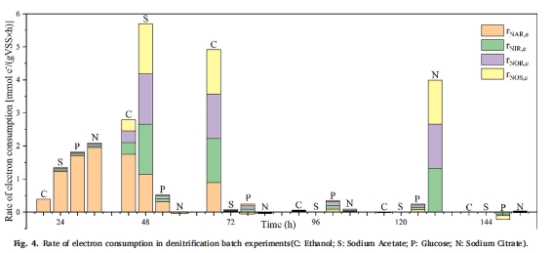 簡單碳源:電子均勻分配至四步反硝化酶(NAR/NIR/NOR/NOS)