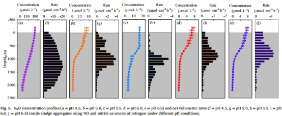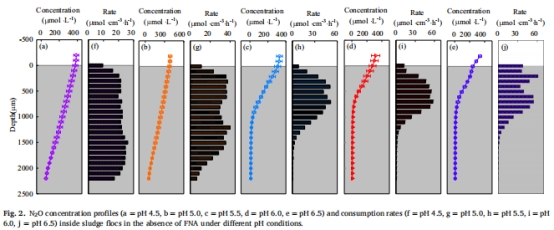 有FNA時(shí)N?O生成速率 圖5f–j FNA存在進(jìn)一步刺激生成速率(pH4.5時(shí)比無FNA高8.4%),增加底物效應(yīng)。