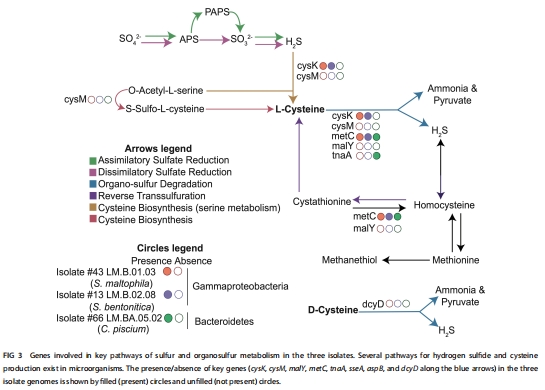 29株淡水好氧細菌可通過半胱氨酸降解產H?S,三株代表菌株(S. maltophilia, S. bentonitica, C. piscium)的基因組均攜帶降解基因。