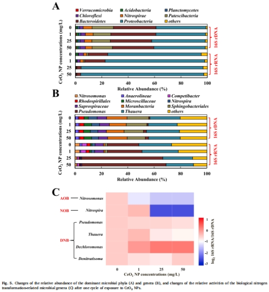 反應器性能:在SBR中測試不同濃度CeO? NPs(0、1、25、50 mg/L)對氮轉化及N?O排放的動態影響(圖1)。