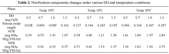 DO=1.0–1.5 mg/L時N?O排放最高(0.187 mg/L,30°C),證明高DO促進AOB的ND路徑(亞硝酸鹽還原)(表2)。