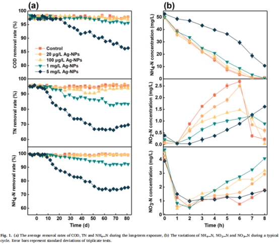 數(shù)據(jù)來源:5 mg/L Ag-NPs使TN去除率從95.4%降至69.7%,NH??-N去除率顯著降低(P<0.05)。