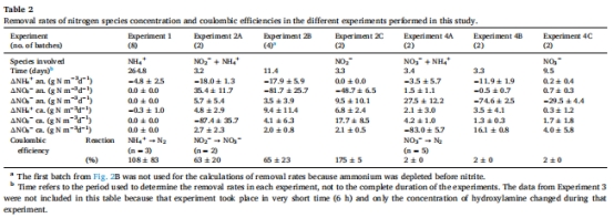 NH??去除:4.8 g N-NH?? m?3 d?1(實驗1),添加NO??后提升至18.0 g N-NH?? m?3 d?1(實驗2A/B);