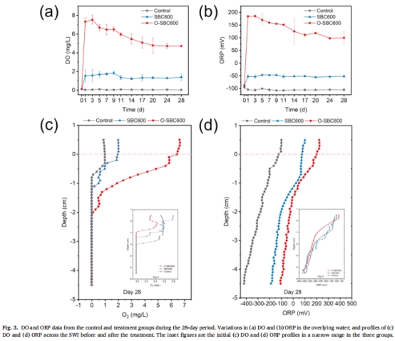精確繪制沉積物-水界面(SWI)的氧滲透梯度(圖3c),證實(shí)O-SBC600使氧滲透深度從1.2 cm增至2 cm。