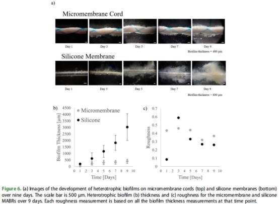 硅膠膜生物膜更厚(3 mm vs. 400 μm)、更均勻(粗糙度系數0.39 vs. 0.33)。