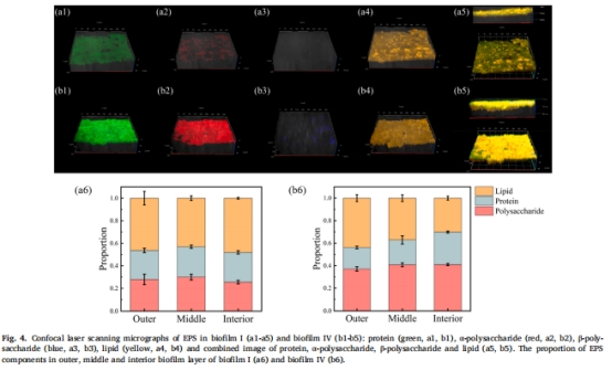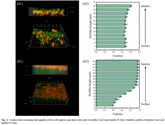 CLSM分析生物膜活性/厚度(圖3);SEM/EPS熒光染色觀察空間分布(圖4);
