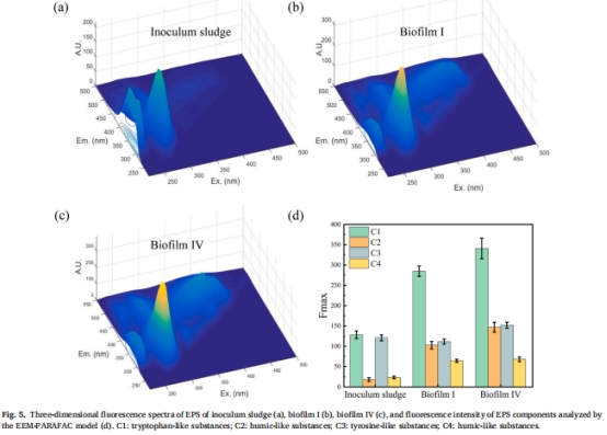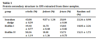 EPS穩定性:色氨酸類物質及蛋白質中α-螺旋和β-折疊比例增加(表1),增強了生物膜結構穩定性(圖5)。