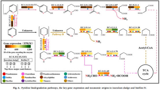 功能菌主導:Pseudomonas和 Delftia通過雙途徑(羥基化+還原)協同降解吡啶。