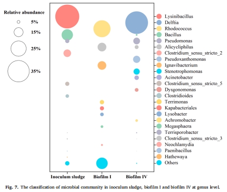 高負荷下 Delftia(36.54%)和 Pseudomonas(10.69%)成為優勢菌;