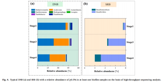 高壓CO?(0.016 MPa) → 生物膜酸化(pH 6.5)→ 嗜酸SRB競爭占優 → DNB豐度下降(Methyloversatilis從41.11%降至17.71%)(圖4)。