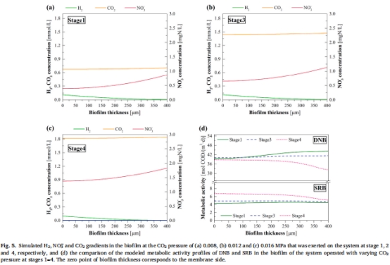 數學模型成功模擬了生物膜內底物梯度(H?、NO??、CO?)和微生物活性變化(圖5)。