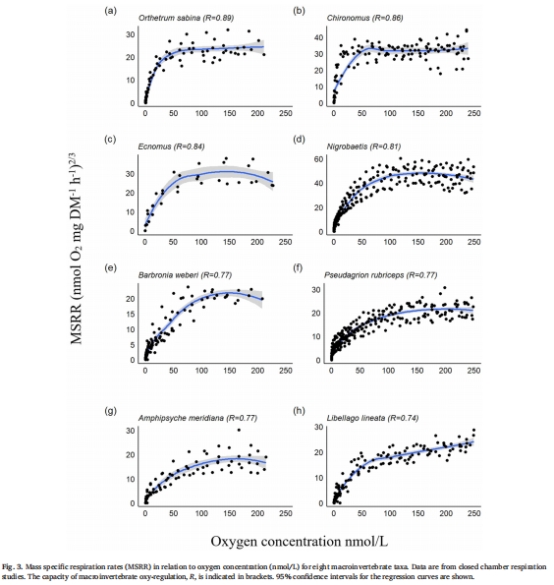 使用Unisense微電極(500μm尖端)在封閉呼吸室測定8類水生昆蟲的氧調節能力(R值,圖3)。
